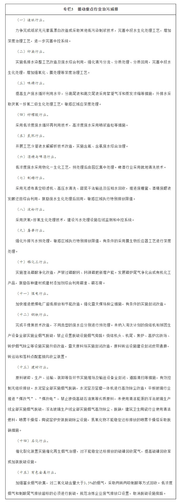 推動(dòng)治污減排工程建設(shè)。各省(區(qū)、市)要制定實(shí)施造紙、印染等十大重點(diǎn)涉水行業(yè)專項(xiàng)治理方案,大幅降低污染物排放強(qiáng)度。電力、鋼鐵、紡織、造紙、石油石化、化工、食品發(fā)酵等高耗水行業(yè)達(dá)到先進(jìn)定額標(biāo)準(zhǔn)。以燃煤電廠超低排放改造為重點(diǎn),對(duì)電力、鋼鐵、建材、石化、有色金屬等重點(diǎn)行業(yè),實(shí)施綜合治理,對(duì)二氧化硫、氮氧化物、煙粉塵以及重金屬等多污染物實(shí)施協(xié)同控制。各省(區(qū)、市)應(yīng)于2017年底前制定專項(xiàng)治理方案并向社會(huì)公開,對(duì)治理不到位的工程項(xiàng)目要公開曝光。制定分行業(yè)治污技術(shù)政策,培育示范企業(yè)和示范工程。