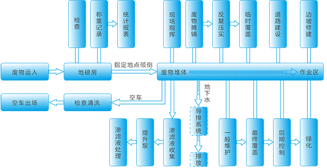 填埋工藝主要有區(qū)域法、壕溝法和綜合法三種。填埋工藝原則:減少裸露填埋作業(yè)面;分層壓實(shí);控制污染源頭;提前規(guī)劃填埋工藝。